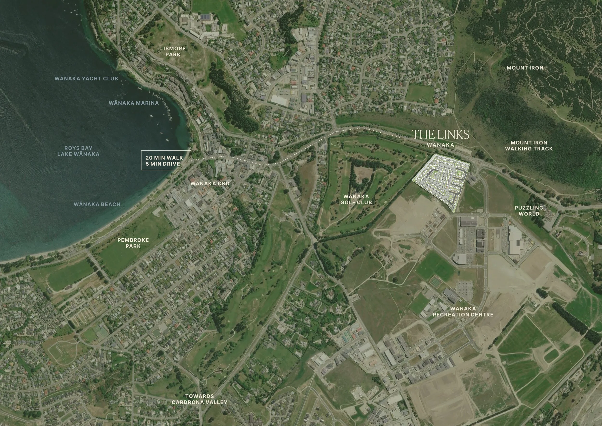 The Links Wānaka is located on the Wānaka - Luggate Highway, directly opposite the Wānaka Golf Club and just moments from both the town centre and the fast-growing Three Parks precinct. It’s a location that brings together open green outlooks, everyday convenience, and the alpine lifestyle Wānaka is known for. With Mount Iron rising just across the road and the golf course at your doorstep, the setting feels spacious and grounded in nature - yet everything you need is within easy reach.